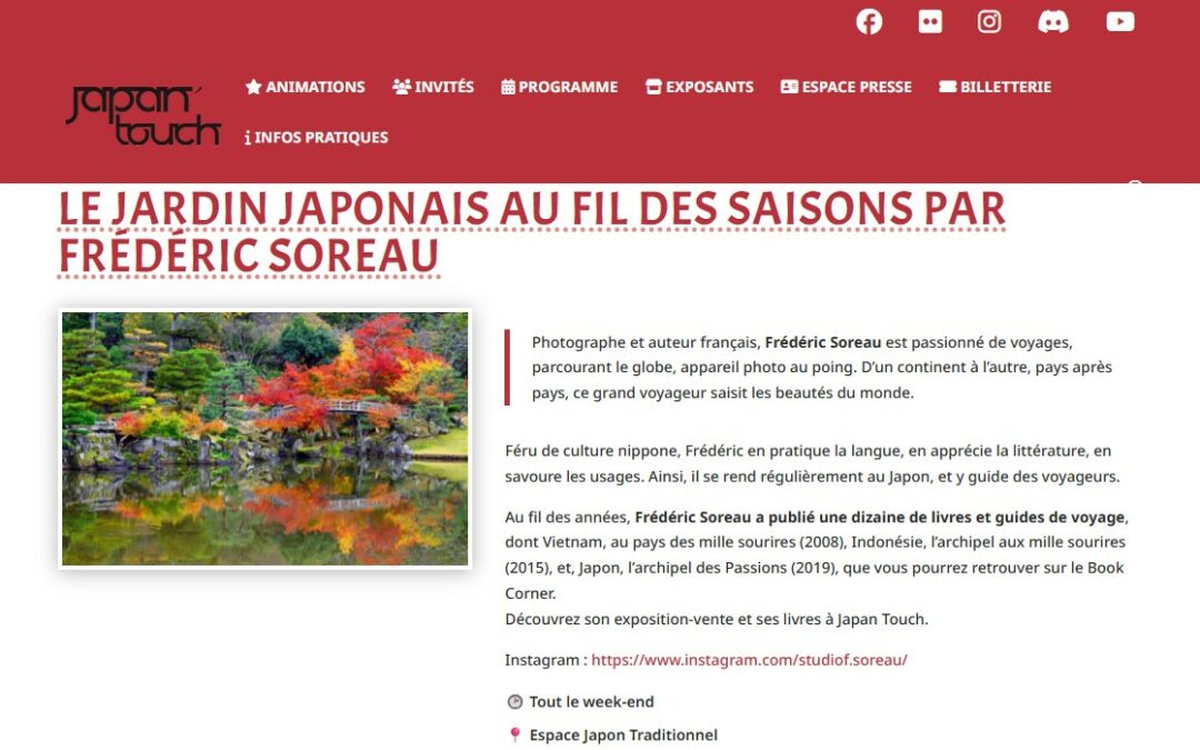 J’ai le plaisir de vous annoncer que mon exposition Le jardin japonais au fil des saisons sera présentée lors du festival Japan Touch – Lyon, 26e édition, dans l’espace Japon Traditionnel.